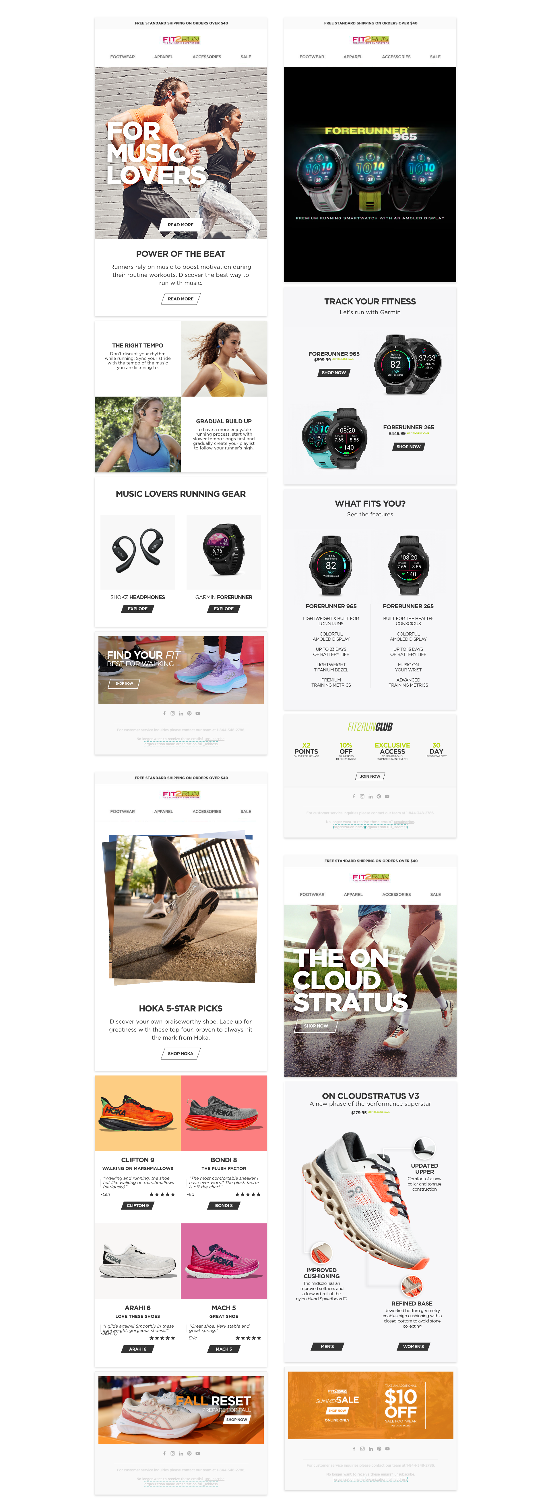 Email marketing is a powerful revenue driver for Fit2Run, generating significant sales and engagement. With daily emails reaching up to half a million customers, these messages serve as key touchpoints for brand recognition. Keeping designs fresh and aligned with brand standards is crucial, as recent revamps have directly led to increased conversions—proving the impact of strong design on consumer behavior. As one of the primary ways customers interact with Fit2Run, each email must reflect the brand consistently, reinforcing trust and a seamless brand experience.