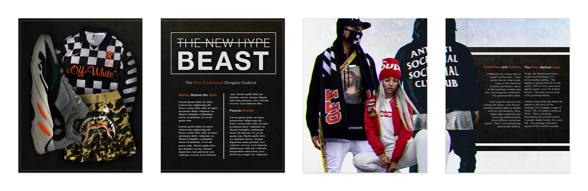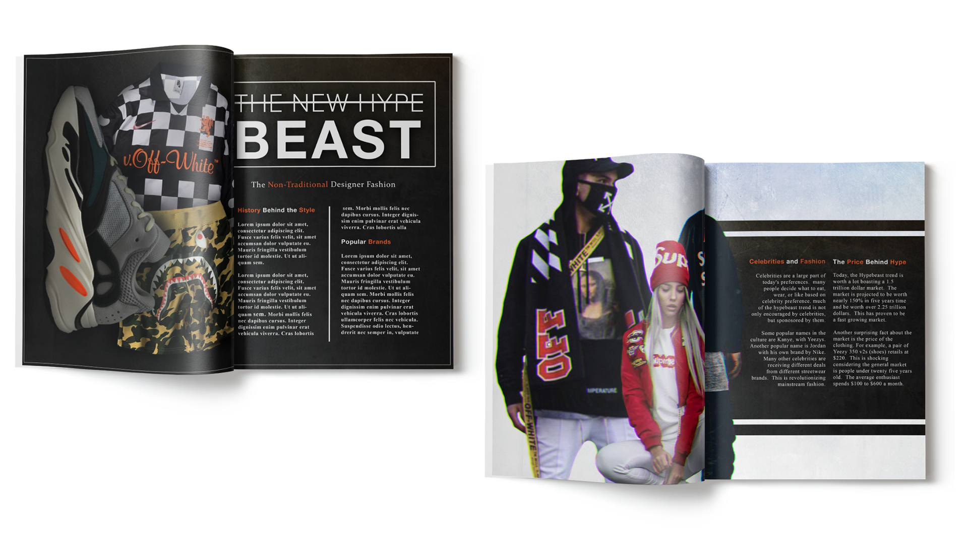 The stylistic choices for the two spreads were thoughtfully composed, blending a harmonious palette of colors, fonts, and imagery. Utilizing the reader-friendly fonts of Helvetica Neue and Times New Roman, the balance of light and dark grays accentuates the vibrant orange, creating a visually compelling focal point that captivates the reader’s attention. The imagery was thoughtfully curated to convey a clear understanding of the term "hypebeast," inviting the reader to grasp its essence effortlessly.